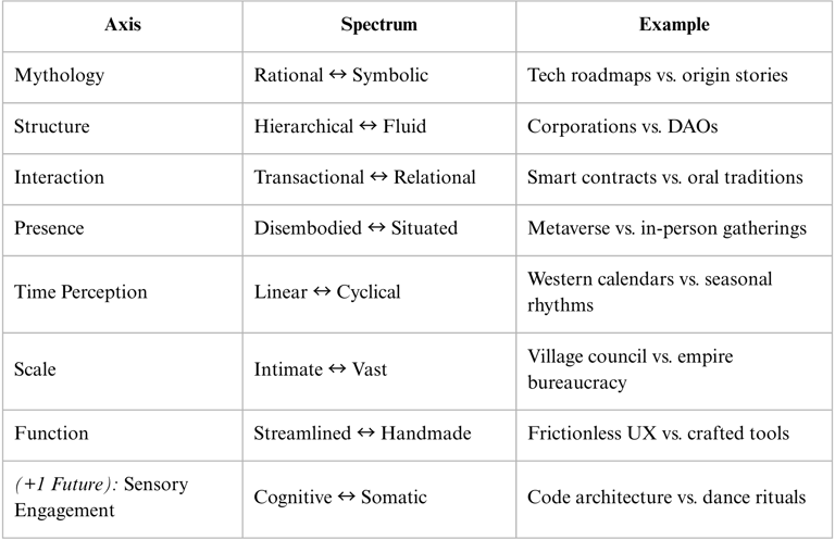 The axes is inspired by Erin Meyer’s Culture Map [1] and Christopher Alexander’s Pattern Language [2], reinterpreted for digital communities and socio-technical systems.